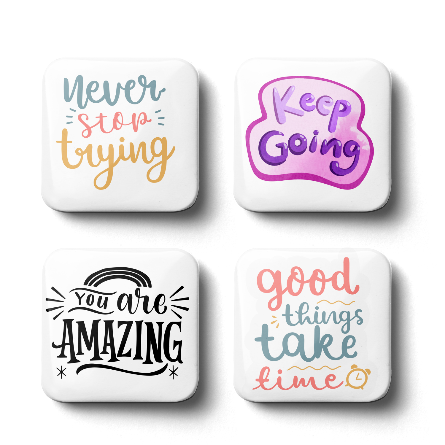 Aceste insigne patrate cu citate motivationale pot fi folosite fie ca magneti pentru frigider, fie ca insigne decorative pentru ghiozdan sau rucsac. Astfel, mesajele inspirationale pot deveni parte din rutina zilnica.