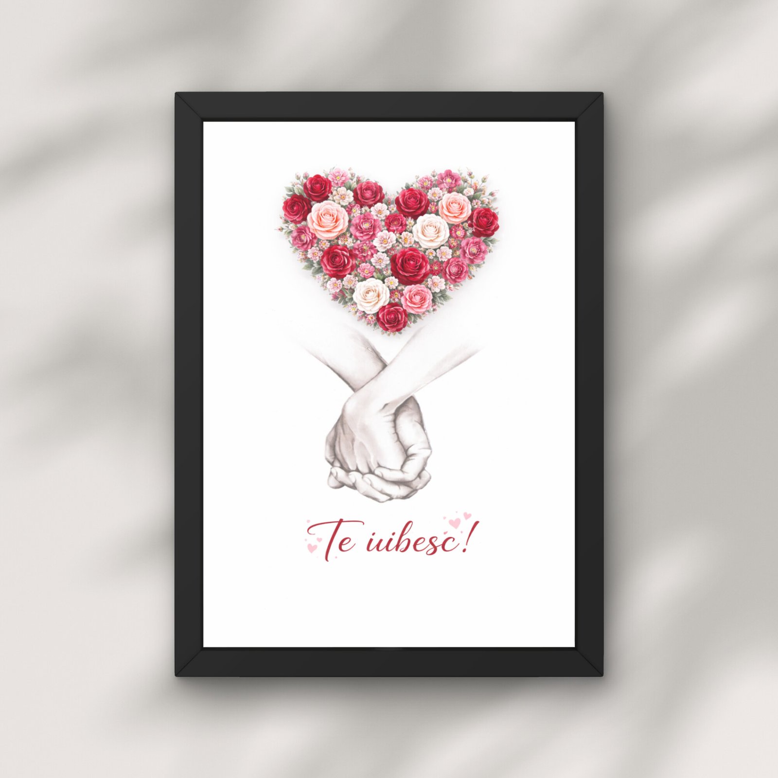 Ilustrația transmite conexiune, protecție și apartenență: două mâini unite, susținând o inimă florală bogată, simbol al iubirii cultivate în timp. Mesajul „Te iubesc!” completează armonios compoziția, fără a deveni strident sau comercial.