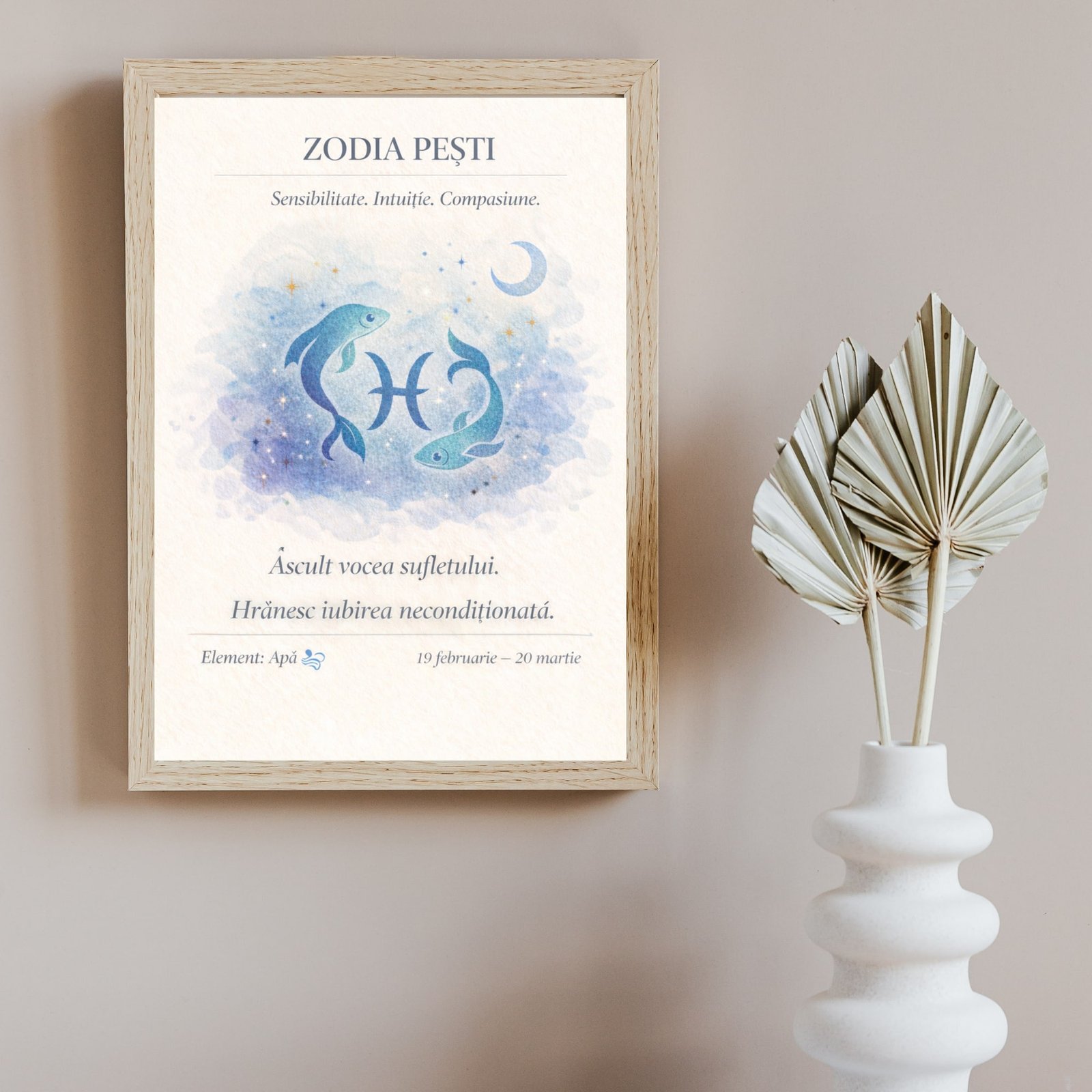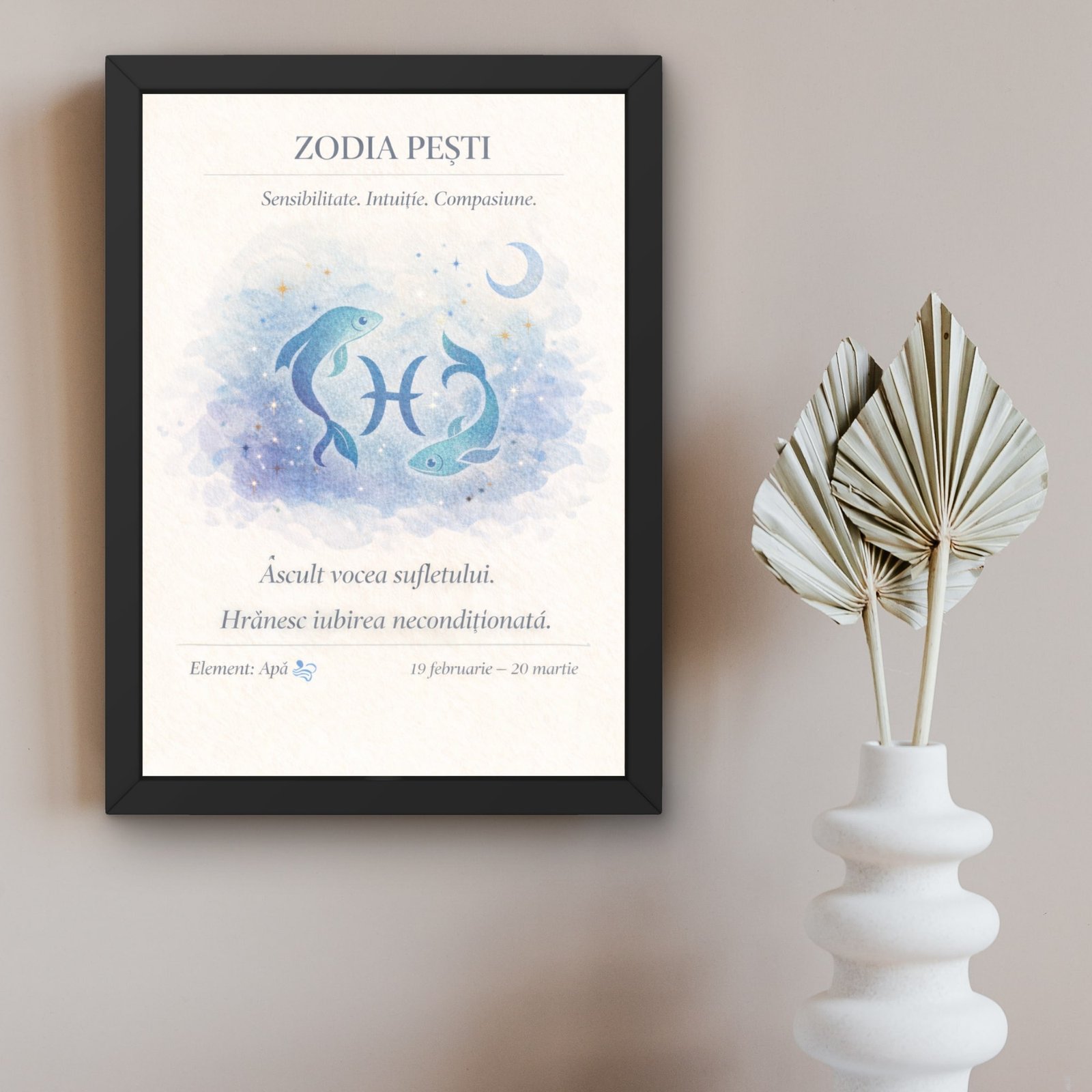 Prin combinația dintre simbol astral, mesaj afirmativ și design delicat, tabloul zodia Pești adaugă profunzime și armonie spațiului în care este expus. Este un decor cu sens, creat pentru cei care apreciază liniștea și conexiunea interioară.